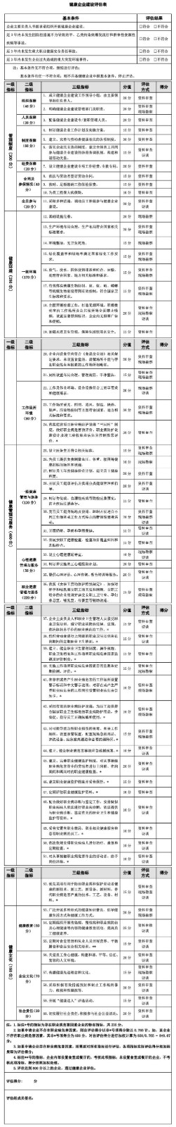 為科學、有序推進健康企業建設工作,指導各地、各企業開展健康企業建設與評估,全國健康企業建設技術指導單位(中國疾病預防控制中心職業衛生與中毒控制所)組織本領域專家,按照《關于開展健康企業建設的通知》(全愛衛辦發〔2019〕3號)和《健康企業建設規范(試行)》的內容與要求編寫了本指南。 各地可結合本地區經濟社會發展水平、行業分布特點、健康城市建設總體部署和企業員工實際需求等因素,參照本指南制定符合本地區健康企業建設需求的技術評估指標體系和指標評估細則,定期對健康企業建設效果進行評估,不斷完善健康企業建設。 一、 編制依據 按照《中華人民共和國職業病防治法》《“健康中國2030”規劃綱要》《健康中國行動(2019-2030年)》《國務院關于進一步加強新時期愛國衛生工作的意見》《全國愛衛會關于開展健康城市健康村鎮建設的指導意見》《關于推進健康企業建設的通知》《健康企業建設規范(試行)》等文件要求,依據我國現行有效的有關法律法規、規范性文件、標準和已經批準的相關國際公約而編制。有關法律法規、規范性文件、標準今后若有更新,以最新版本為準。 二、 主要內容 01 健康企業建設評估表 根據《健康企業建設規范(試行)》內容,構建具體的健康企業建設評估指標體系,包括基本條件和具體指標兩部分。基本條件為一票否決項,具體指標包括企業通用指標43項(標注“**”號的指標1項,企業內部設置食堂或餐廳的考核適用此項指標)和存在業病危害因素企業特有指標17項(標注為“*”號項),評分采用千分制。 具體評估指標包括一級、二級和三級指標,第三級指標有相應的具體分值及評估方式。一級指標對應“管理制度”、“健康環境”、“健康管理與服務”、“健康文化”4個建設領域;二級和三級指標著眼于我國職業人群的主要健康問題及其影響因素。指標體系構建強調健康企業建設秉持“大衛生、大健康”理念,實施“把健康融入所有政策”策略,堅持“共建共享”,同時強調預防為主,全方位全周期保障職業人群健康。