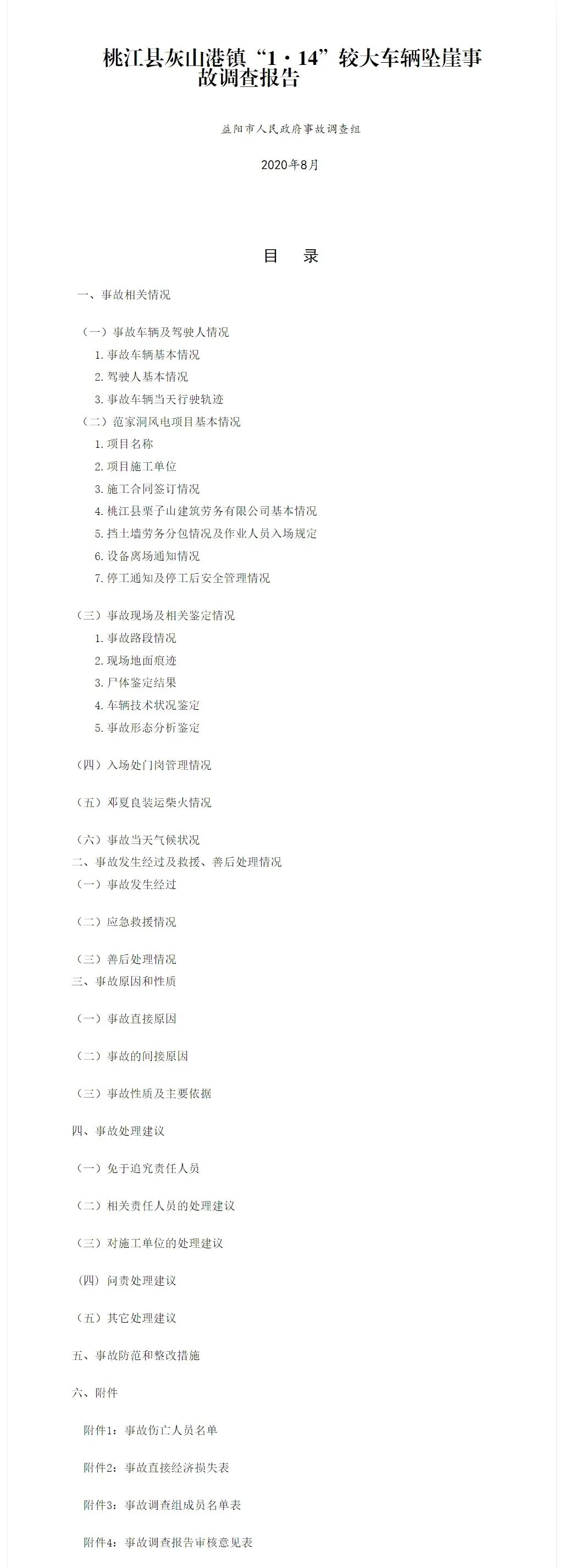 9月18日,湖南益陽市應(yīng)急管理局發(fā)布桃江縣灰山港鎮(zhèn)“1·14”較大車輛墜崖事故調(diào)查報(bào)告。事故為2020年1月14日17時(shí)10分許,在桃江縣灰山港鎮(zhèn)范家洞風(fēng)電項(xiàng)目場(chǎng)內(nèi)道路5-1#主干道18#機(jī)位處發(fā)生一起車輛墜崖事故,導(dǎo)致5人死亡,車輛受損報(bào)廢,直接經(jīng)濟(jì)損失約528萬元。報(bào)告原文如下:
