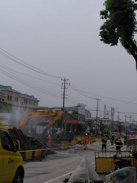 據(jù)附近市民介紹,近期,國權(quán)北路正在進(jìn)行道路施工。昨天下午,一臺(tái)挖掘機(jī)在作業(yè)時(shí),不慎將地下一根燃?xì)夤艿劳跀啵D時(shí),大量氣體從管道內(nèi)噴出,空氣中還彌漫著一股濃烈的煤氣味。目擊者稱,管道被挖破后,現(xiàn)場噴出白色氣體,并不斷發(fā)出“嗤嗤”的聲音,工人們見狀,趕緊將挖掘機(jī)熄火。